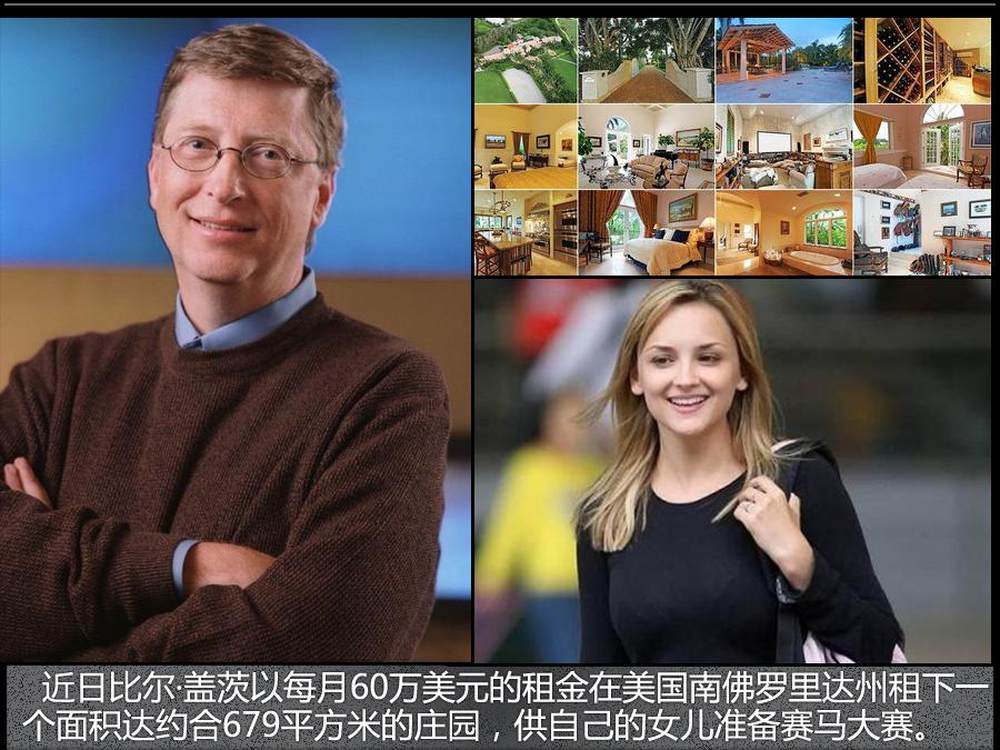 微软联合创始人比尔·盖茨以每月60万美元的租金在美国南佛罗里达州租下一个面积达7300平方英尺(约合679平方米)的庄园,供自己的女儿准备赛马大赛。当然,比尔·盖茨在其它地方拥有至少两套住宅,但它们都无法满足盖茨15岁的女儿詹妮弗及其赛马的要求。盖茨最近在佛罗里达州惠灵顿租下的这套公寓有马棚,有赛马训练场,还有一条戒备起来的马路。