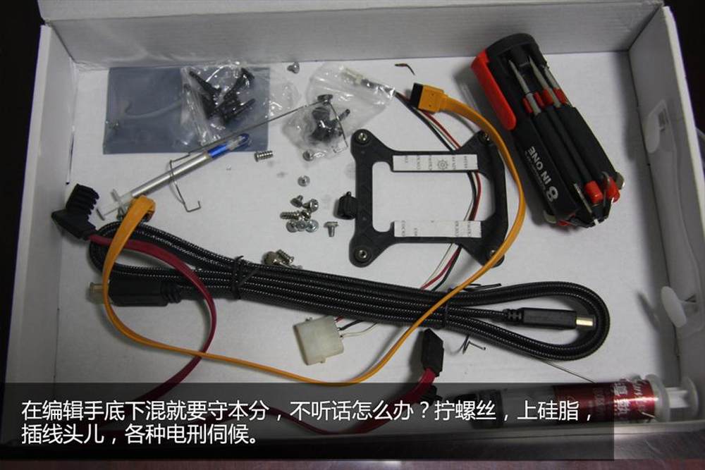 要装机必备工具还是不能少的,螺丝刀、硅脂、线、螺丝,怎么还有跟HDMI线?往下看,等下就告诉你做什么的。