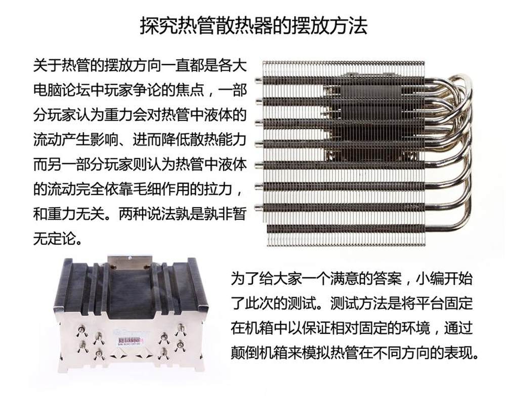 关于热管的摆放方向一直都是各大电脑论坛中玩家争论的焦点,一部分玩家认为重力会对热管中液体的流动产生影响、进而降低散热能力而另一部分玩家则认为热管中液体的流动完全依靠毛细作用的拉力,和重力无关。两种说法孰是孰非暂无定论。2/15