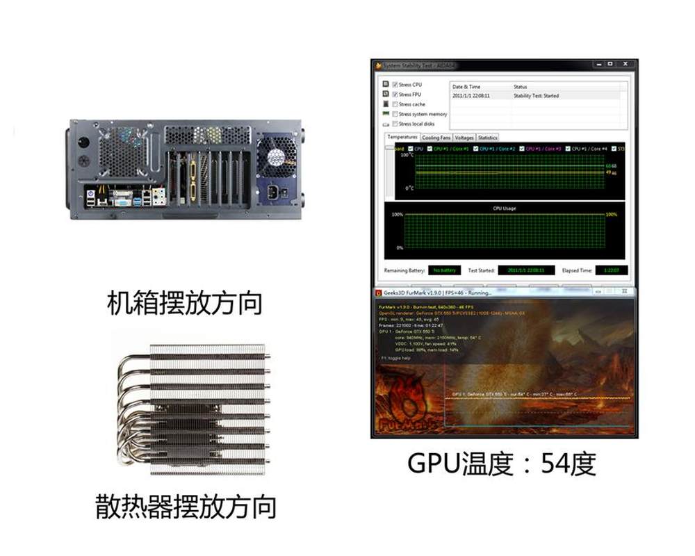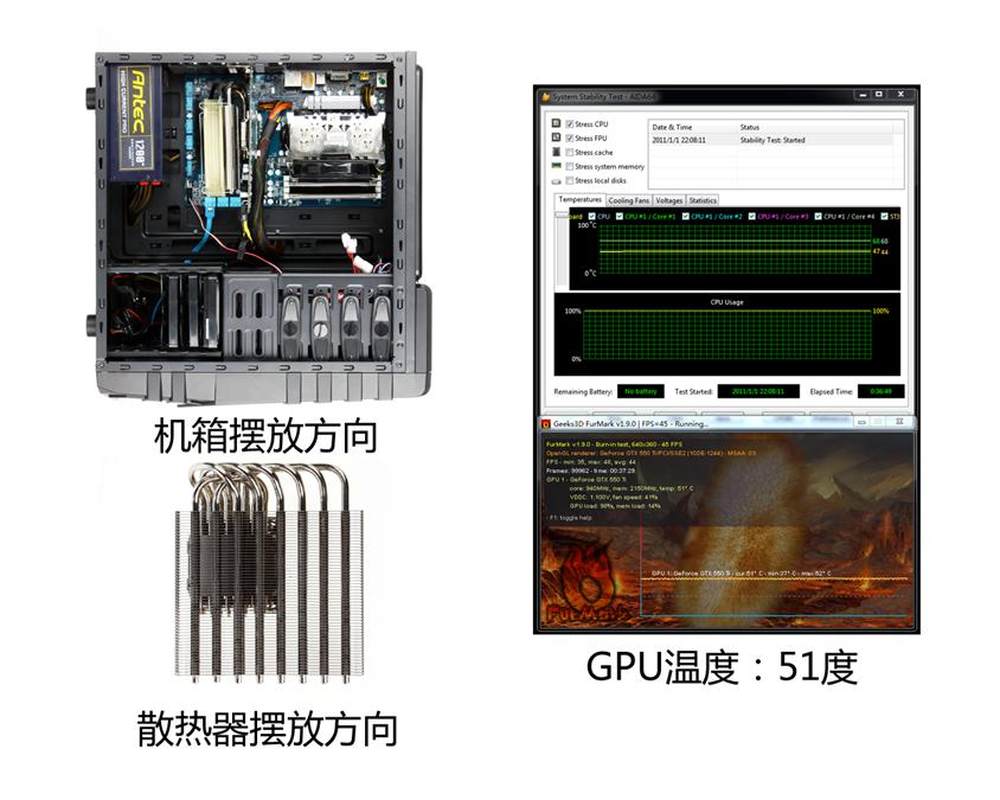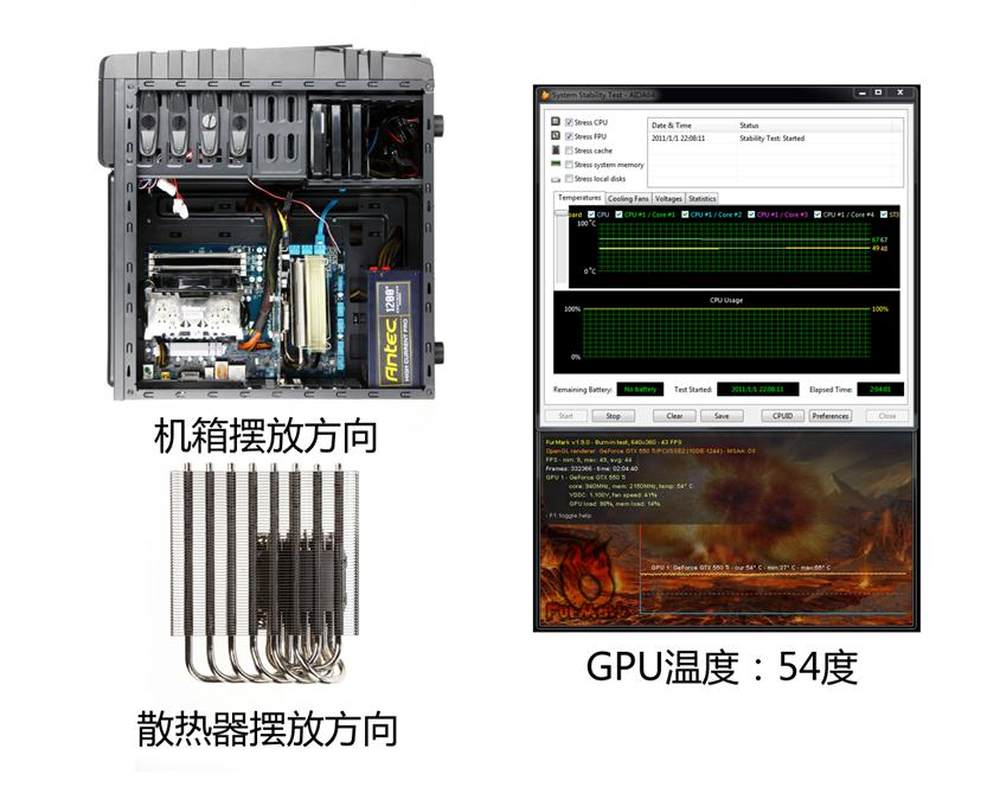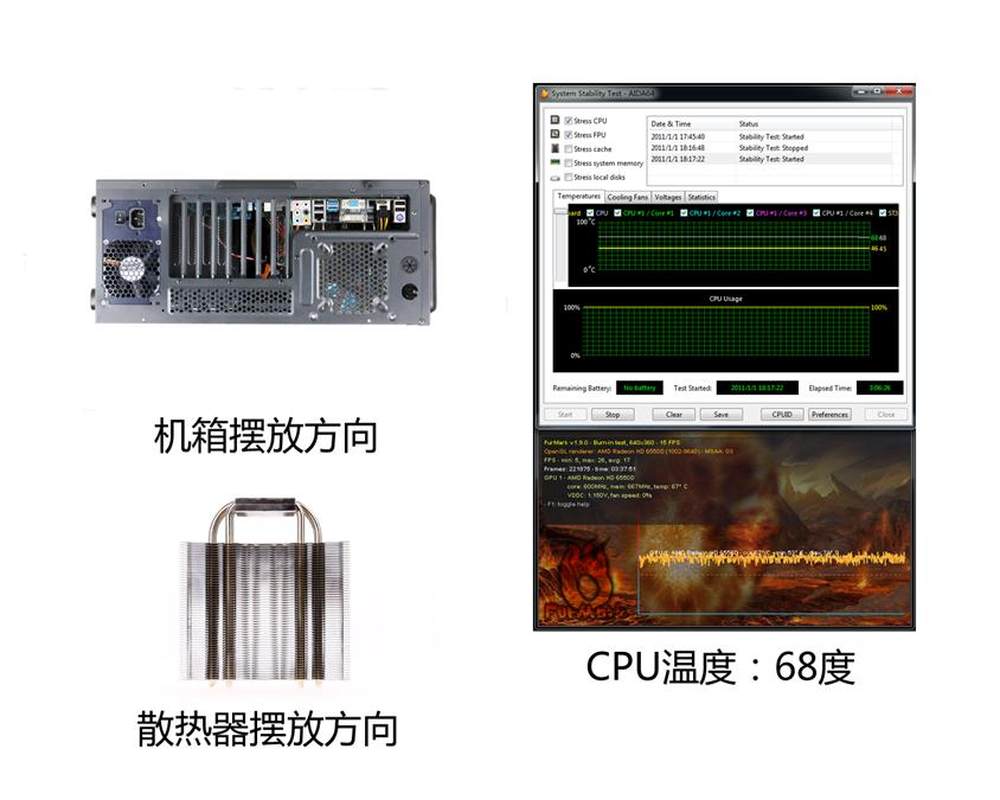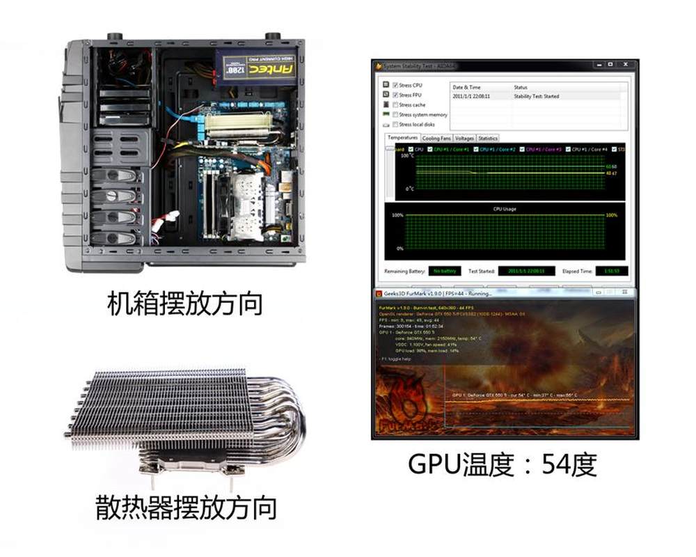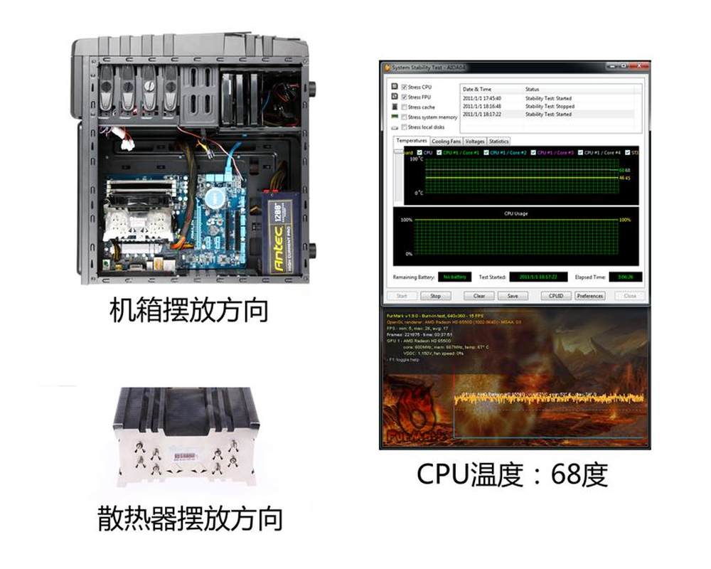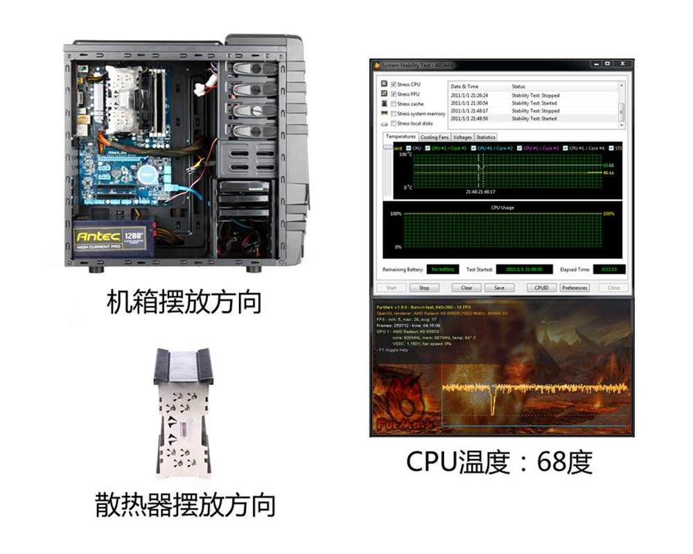 测试平台:采用APU集显平台,测试CPU散热器摆放方向时,记录AIDA64显示温度,Furmark仅仅作为令APU集显满载使用,温度无参考意义;测试GPU散热器摆放方向时,记录Furmark所显示温度。5/15