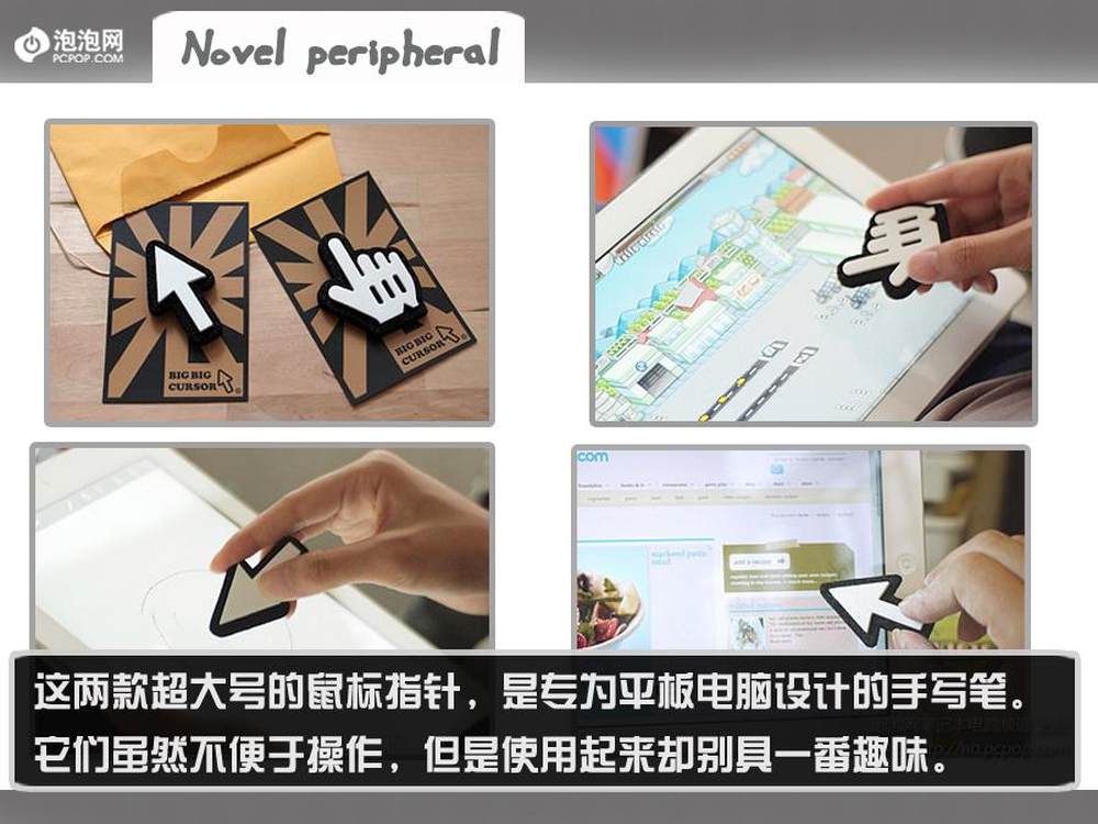 这两款超大号的鼠标指针,是专为平板电脑设计的手写笔。它们虽然不像规范的手写笔那样便于操作,但是使用起来却别具一番趣味。值得一提的是,该手写笔内置磁铁,可以吸附在电脑的铁质保护壳上,既方便携带,也弥补了iPad上没有鼠标可用的遗憾。