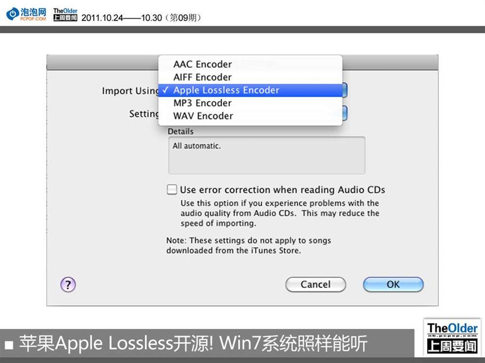 从苹果获悉,目前官方宣布成立Apple Lossless Audio Codec project,将Apple Lossless音乐格式开源,且公布了相关的编解码器产品。Apple Lossless格式,是苹果创造的无损音乐格式,它类似于APE和FLAC可以实现较小容量的声音无损播放。ALAC格式将以Apache 2.0的许可向用户和开发者发放,这意味着第三方操作系统和设备都将可以开始支持这种以前从来未被iPod外的设备支持过的格式。11/16