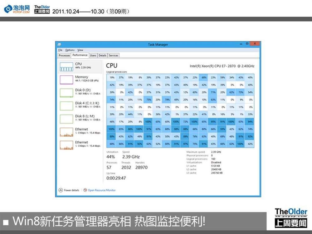 据国外媒体报道,Windows 8开发博客近日公布了下一代操作系统的任务管理器新特性,“简单”监控处理器的资源消耗情况成为设计主旨。据相关人士介绍,在windows7的任务管理器中用户很难监控每个处理器在处理繁重任务时的资源消耗情况。但在Windows 8中,每一个逻辑处理器的工作状况均采用“方框 文字”的热图形式展现出系统的工作状况,最高可达640个逻辑处理器。10/16