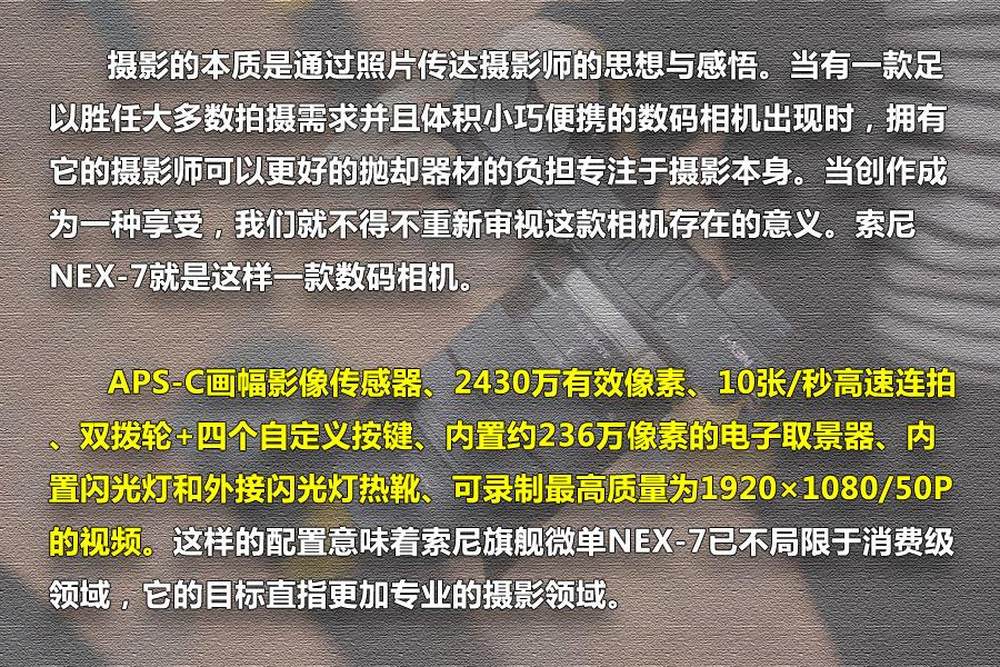 APS-C画幅影像传感器、2430万有效像素、10张/秒高速连拍、双拨轮 四个自定义按键、内置约236万像素的电子取景器、内置闪光灯和外接闪光灯热靴、可录制最高质量为1920×1080/50P的视频。这样的配置意味着索尼旗舰微单NEX-7已不局限于消费级领域,它的目标直指更加专业的摄影领域。3/54