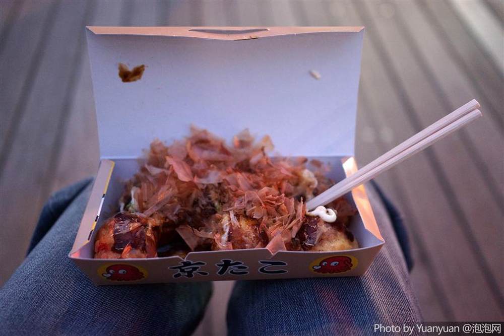 晚餐时间还没到,我已经饿了。正好看到路边有卖章鱼丸子(日文好像叫“TAKAYUKI”)的,买了两盒,发现味道还真不错。最特别的是每一个章鱼丸子里夹的馅味道都不一样。7/54