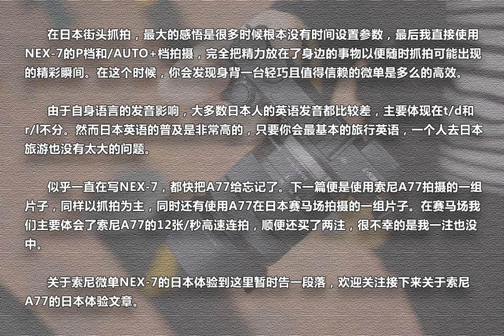 关于索尼微单NEX-7的日本体验到这里暂时告一段落,欢迎关注接下来关于索尼A77的日本体验文章。