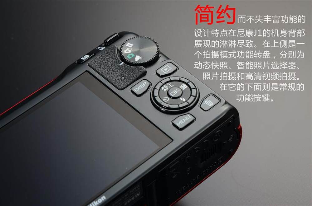 简约而不失丰富功能的设计特点在尼康J1的机身背部展现的淋淋尽致。在上侧是拍摄模式功能转盘,分别为动态快照、智能照片选择器、照片拍摄和高清视频拍摄。在它的下面则是常规的功能按键。5/12