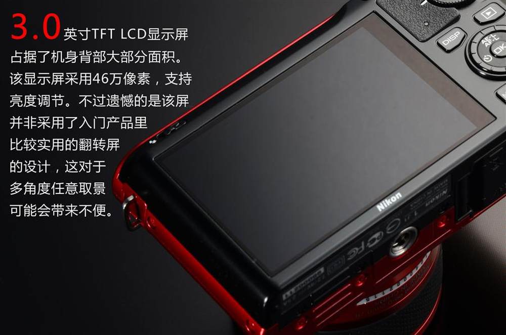 3.0英寸TFT LCD显示屏占据了机身背部大部分面积。该显示屏采用46万像素,支持亮度调节。不过遗憾的是该屏并非采用了入门产品里比较实用的翻转屏的设计,这对于多角度任意取景可能会带来不便。6/12