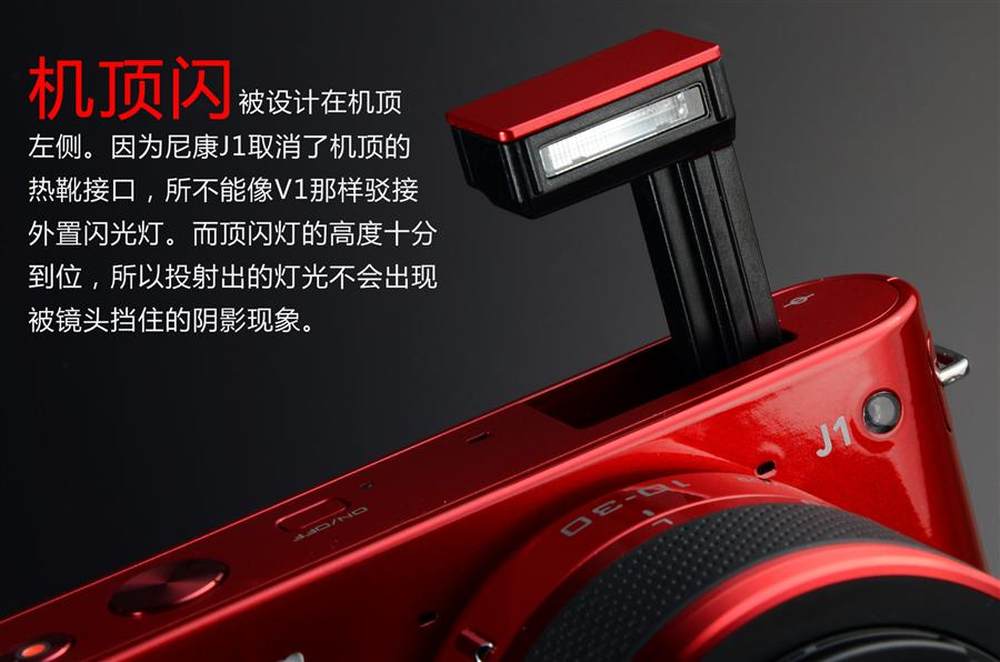 机顶闪被设计在机顶左侧。因为尼康J1取消了机顶的热靴接口,所不能像V1那样驳接外置闪光灯。而顶闪灯的高度十分到位,所以投射出的灯光不会出现被镜头挡住的阴影现象。9/12