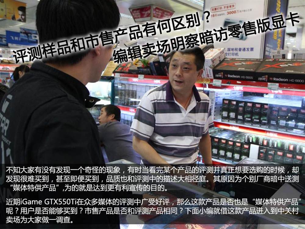 近期iGame GTX550Ti在众多媒体的评测中广受好评,那么这款产品是否也是“媒体特供产品”呢?用户是否能够买到?市售产品是否和评测产品相同?下面小编就借这款产品进入到中关村卖场为大家做一调查。2/14