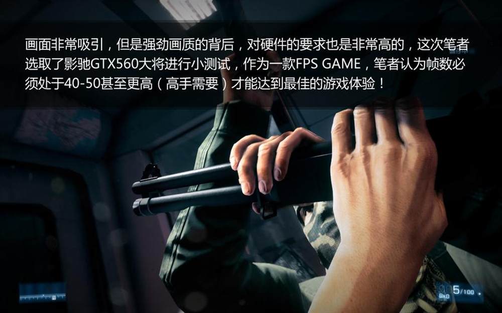 画面非常吸引,但是强劲画质的背后,对硬件的要求也是非常高的,这次笔者选取了影驰GTX560大将进行小测试,作为一款FPS GAME,笔者认为帧数必须处于40-50甚至更高(高手需要)才能达到最佳的游戏体验!4/25