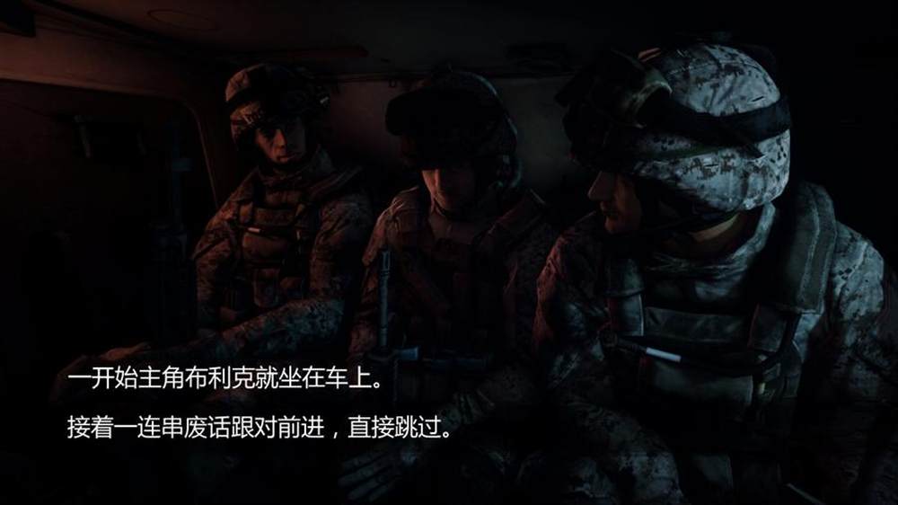 一开始主角布利克就坐在车上,接着一连串废话跟对前进,直接跳过。一出场队友就被放倒了,好像没挂。7/25