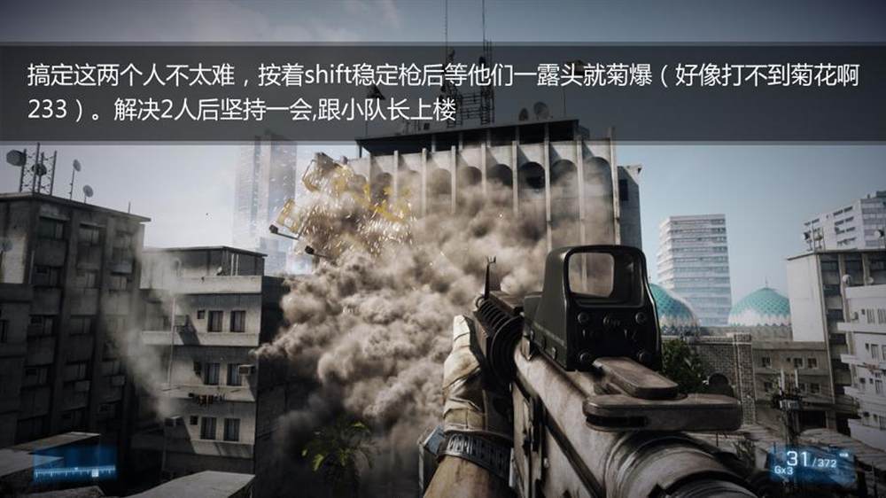 搞定这两个人不太难,按着shift稳定枪后等他们一露头就菊爆(好像打不到菊花啊233)。解决2人后坚持一会,跟小队长上楼11/25