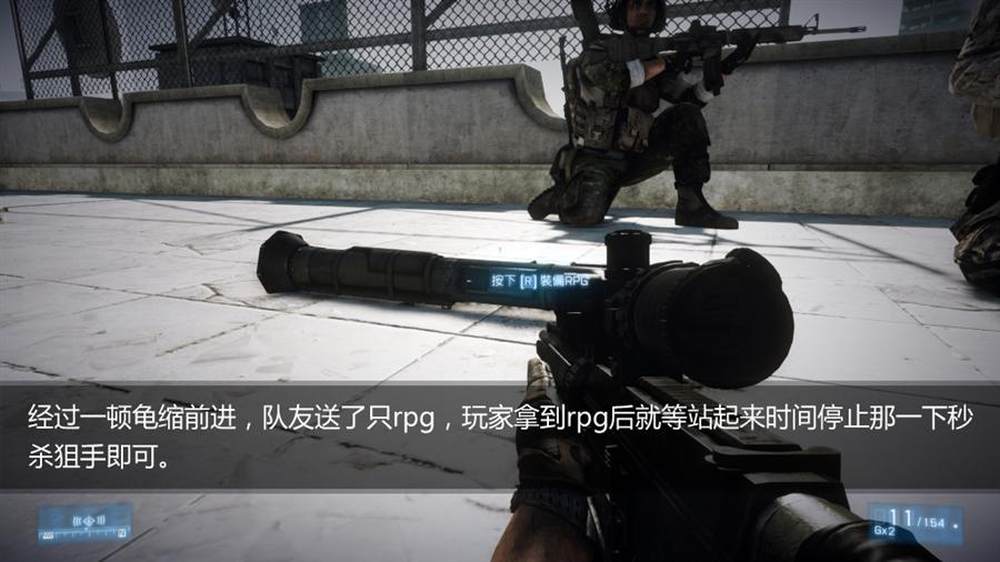 经过一顿龟缩前进,队友送了只rpg,玩家拿到rpg后就等站起来时间停止那一下秒杀狙手即可。14/25