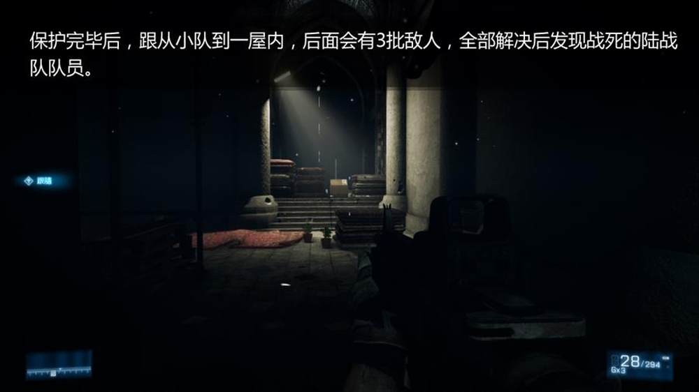 保护完毕后,跟从小队到一屋内,后面会有3批敌人,全部解决后发现战死的陆战队队员。18/25