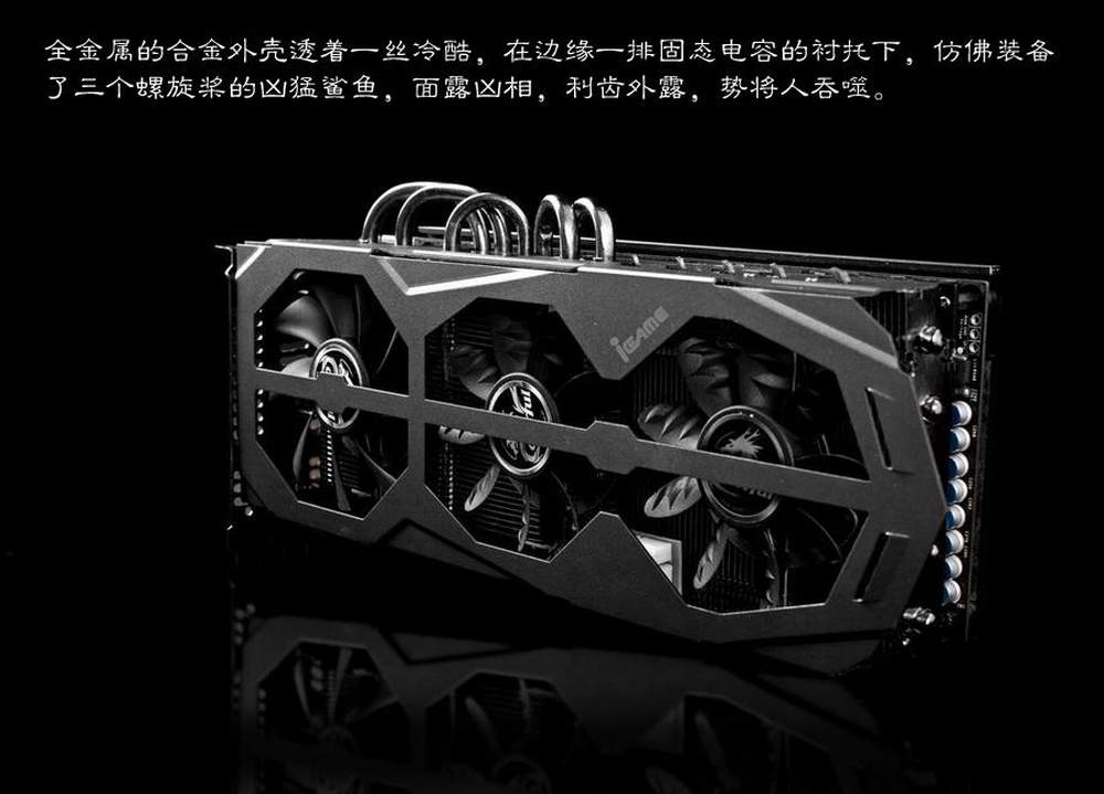 沿用七彩虹引以为荣的“鲨鱼仿生学”的三风扇设计。使用一个9CM风扇搭配两个8CM鲨鱼仿生学风扇组成大小风扇混合散热系统(Hybrid Fan System)。利用这种科学的配比组合,比一般的三风扇降噪最高幅度达到15dB,风量最高提升40%%。全金属的合金外壳透着一丝冷酷,在边缘一排固态电容的衬托下,仿佛装备了三个螺旋桨的凶猛鲨鱼,面露凶相,利齿外露,势将人吞噬。3/19