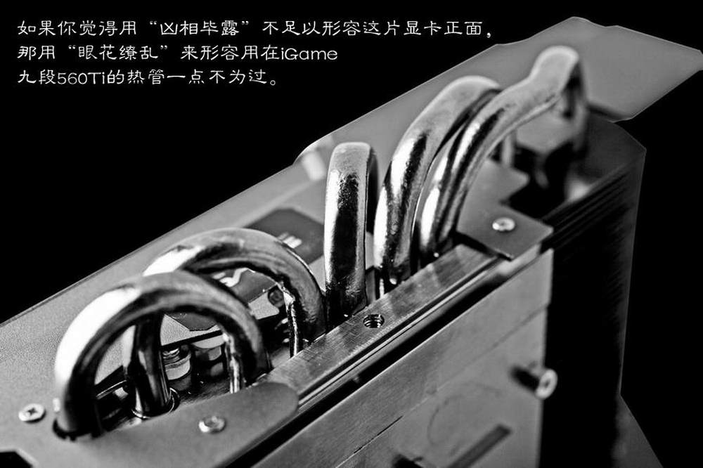 如果你觉得用“凶相毕露”不足以形容这片显卡正面,那用“眼花缭乱”来形容用在iGame九段560Ti的热管一点不为过。