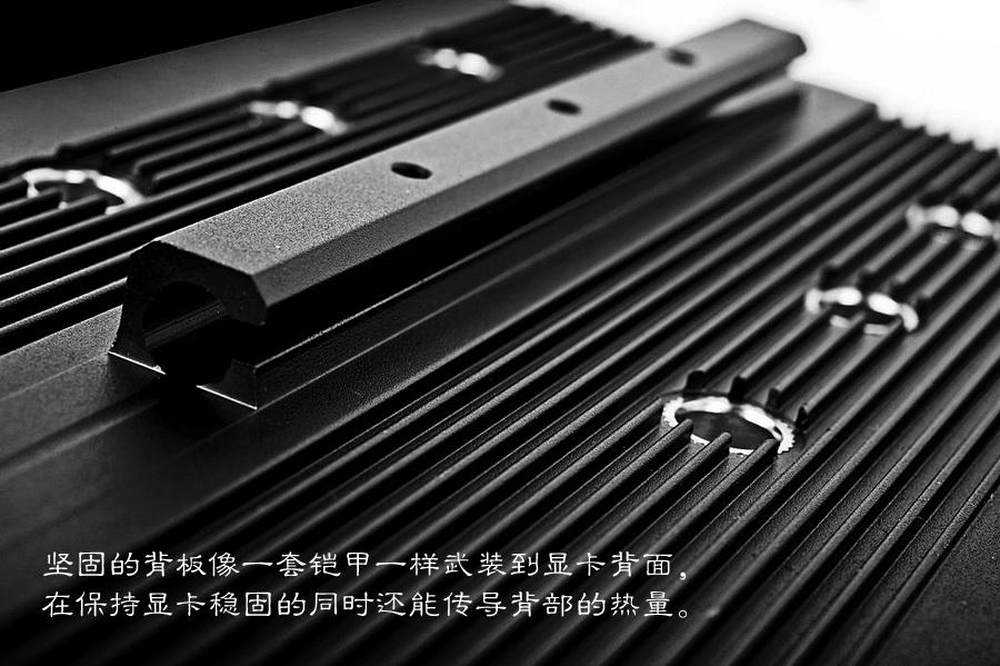 2mm厚的背板像一套铠甲一样武装到显卡背面,在保持显卡稳固的同时还能传到背部的热量。从背部特写图里面可以看到有一个滑槽,到底有什么用呢?到后面我们再来看。