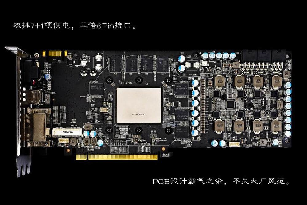 如果你觉得用“全副武装”不足以形容显卡背面,那用“巧夺天工”来兄容显卡的PCB设计一点也不为过。