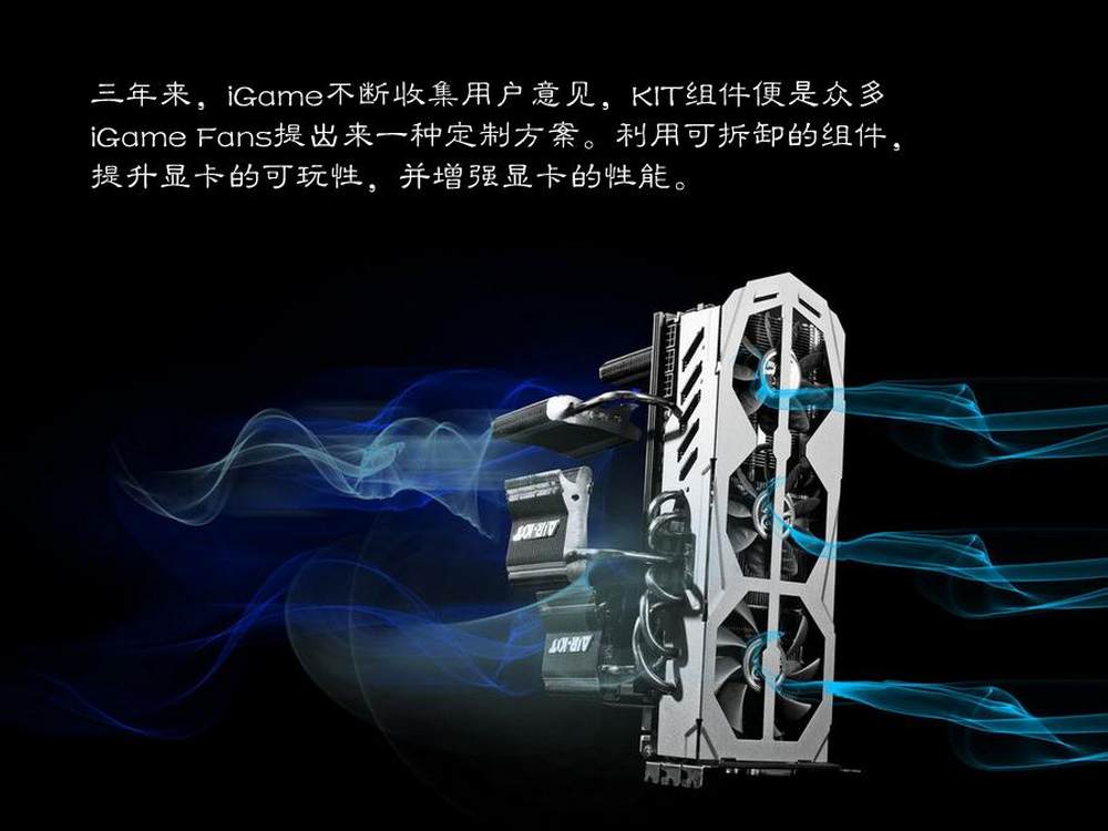 利用可拆卸的组件,提升显卡的可玩性,并增强显卡的性能。此次七彩虹提供了三个功能模块化系统给玩家。包括Air-Kit,Turbo-Kit 和Color-Kit。使用这三种套件,无论你是普通青年,还是文艺青年,抑或X13青年,都能找到自己想要的功能,打造属于自己的强悍显卡。10/19