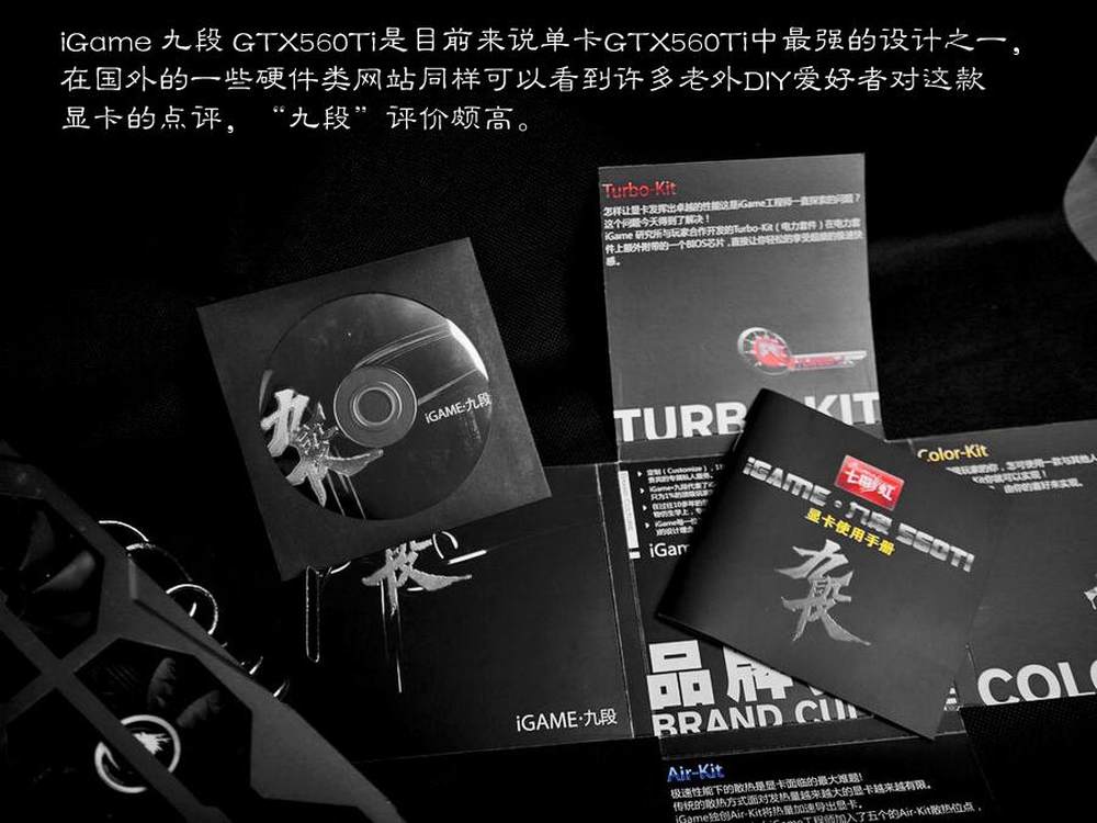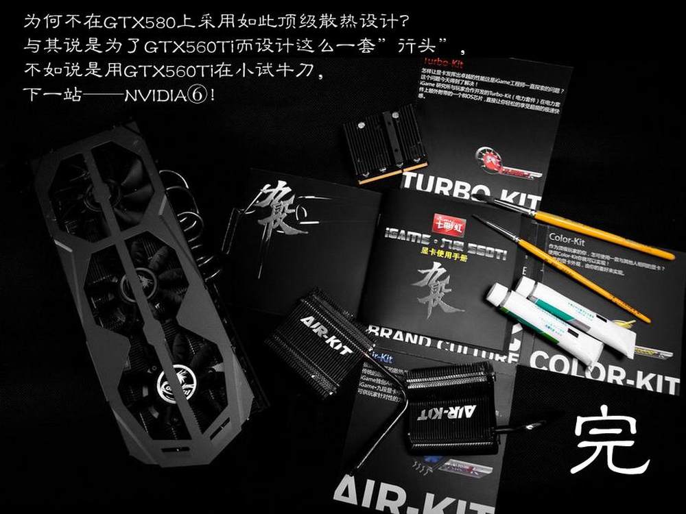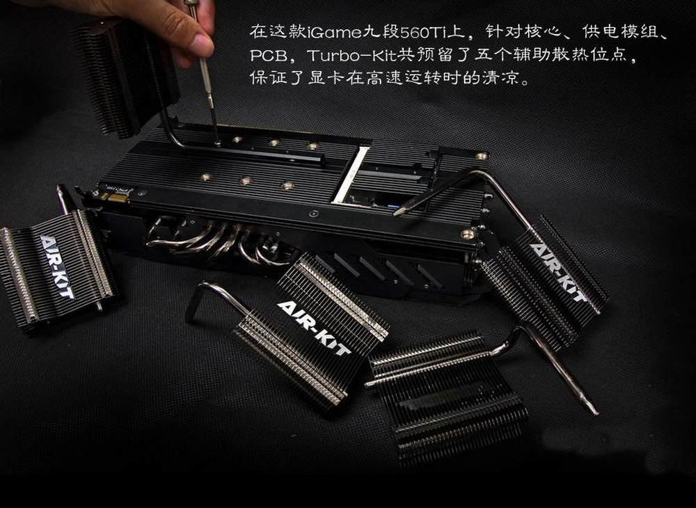 第一代Air-Kit曾装载在iGame460上,利用这项设计,iGame460曾夺得了红棉奖。而在这款顶级设计的显卡上,当然少不了Air-Kit。在这款iGame九段560Ti上,针对核心,供电模组,PCB,Turbo-Kit等共预留了五个辅助散热位点,保证了显卡在高速运转时的清凉。11/19