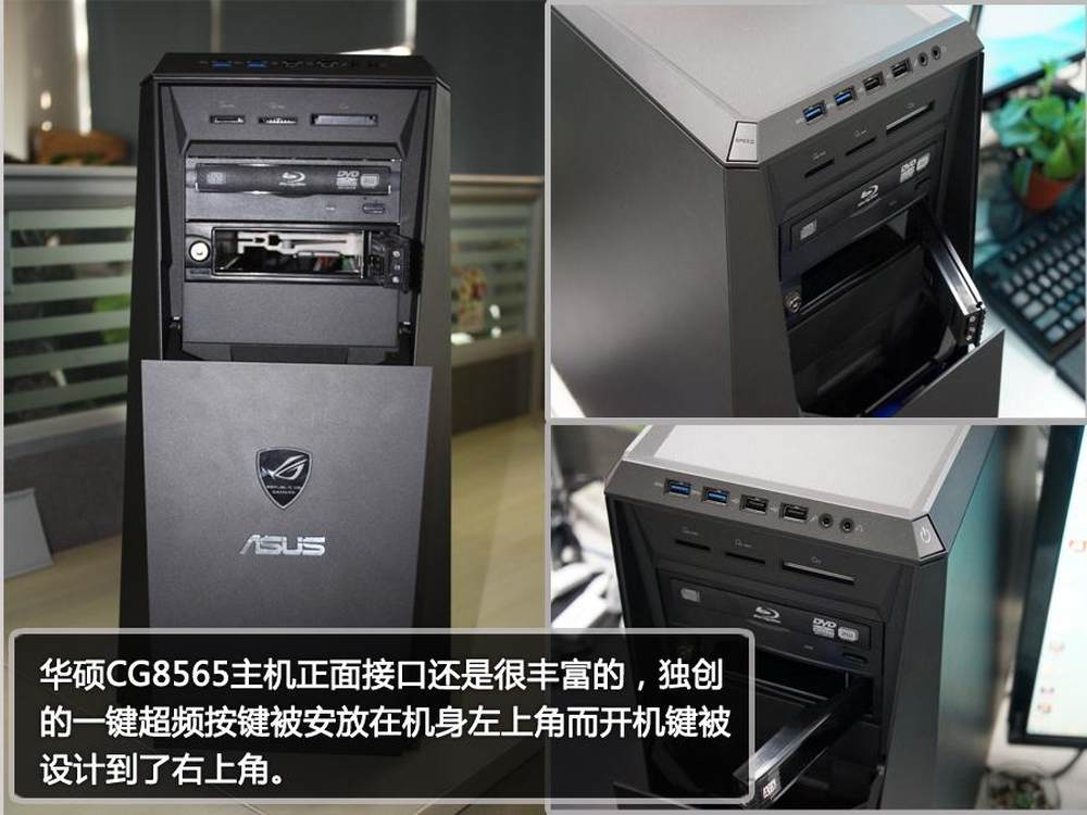 正面的接口十分丰富,独创的一键超频按键被涉及到了机身左上方而开机键则在右上方。12/34