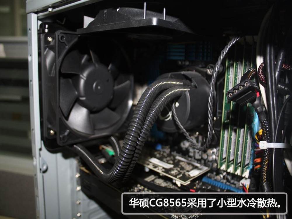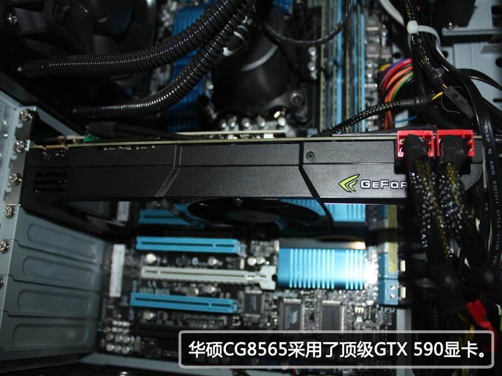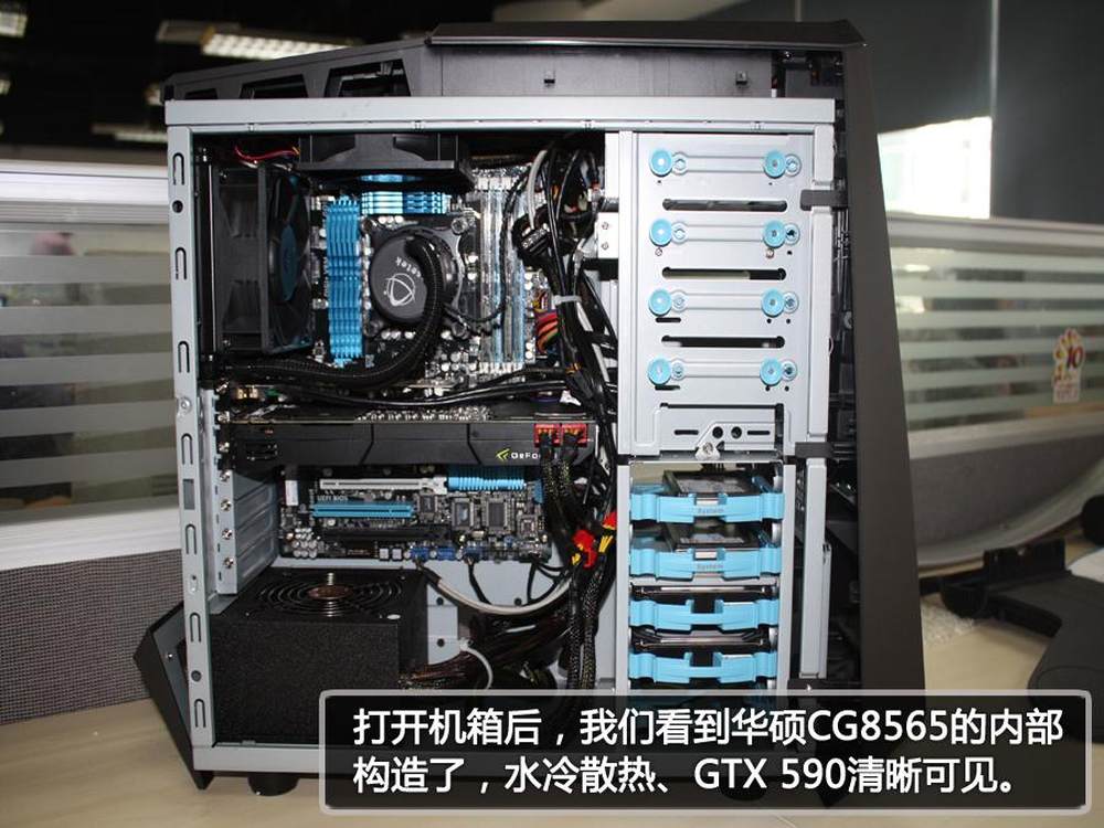 打开机箱后,我们看到华硕CG8565的内部构造了,水冷散热。GTX 590清晰可见。16/34