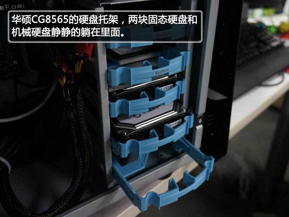 华硕CG8565的硬盘托架,两块固态硬盘和2块机械硬盘静静的躺在里面。19/34