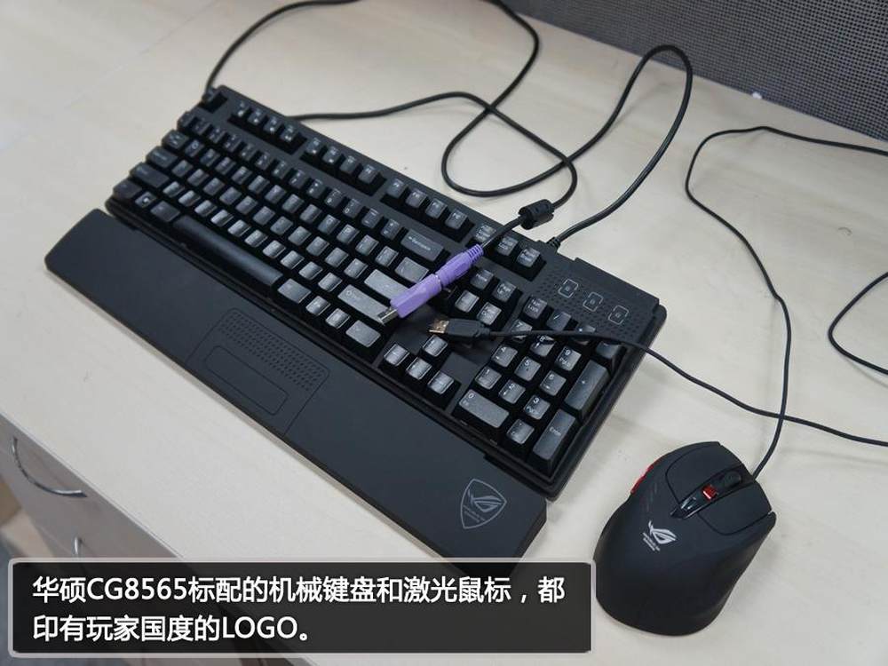 华硕GC8565标配机械键盘和激光鼠标,上面都印有玩家国度的LOGO。21/34