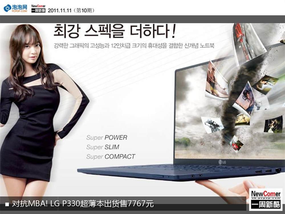 据韩国媒体报道,LG目前已正式出货13.3吋Xnote P330超轻薄笔记本。据悉,该机搭载i5-2435M低电压处理器,厚度17mm,续航可达6.5小时,售价1364000韩元(约7767元人民币)。据了解,LG Xnote P330采用铝镁合金维克,显示器采用IPS面板。从官方描述来看,该机厚度为17mm,最薄处11mm,仅重1.65千克,并未用户提供了6.5小时左右的续航,十分便携。硬件上,该机搭载Intel酷睿i5-2435M处理器,标配4G内存、NVIDIA GeForce 555M独显及1TB硬盘。此外,该机支持NVIDIA Optimus显卡切换,硬盘方面用户还可选配SSD。(详情请看:http://www.pcpop.com/doc/0/729/729949.shtml)5/9