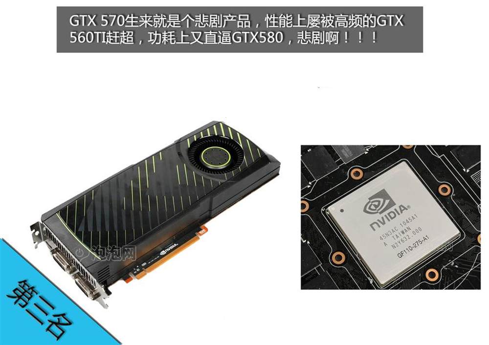 GTX570就是一个高不成低不就的悲剧显卡,高端比不上GTX580,向下又没比GTX560TI领先太多,功耗却是直逼GTX580,价格还贵不少,定位很尴尬啊。10/11