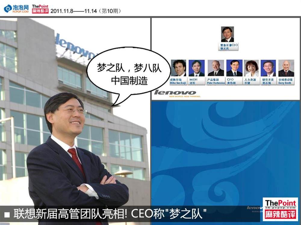 9日下午联想集团公布了新一届最高管理团队LEC(联想集团执行委员会,Lenovo Executive Committee)名单。其中,包括联想集团董事局主席兼CEO杨元庆和联想集团高级副总裁、CFO黄伟明。此外在采访中,杨元庆称该团队为“梦之队”。并再次肯定,对超越惠普PC的未来目标机信心。(详情请看:http://www.pcpop.com/doc/0/731/731018.shtml)4/9