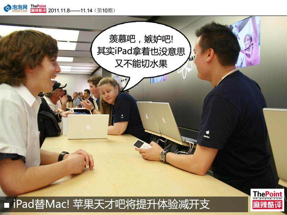 据国外媒体报道,苹果旗下部分Apple Store的Genius Bar(天才吧)将陆续使用iPad来代替MacBook Pro,以此来改善用户的体验度。据苹果相关人士透露,iPad的到来将使苹果员工的工作更为轻松,同时也有利于提升用户的服务体验,员工不必再因为移动MacBook Pro给用户观看等问题伤神了。另外,苹果公司无疑也可以节省大笔开支。(详情请看:http://www.pcpop.com/doc/0/731/731979.shtml