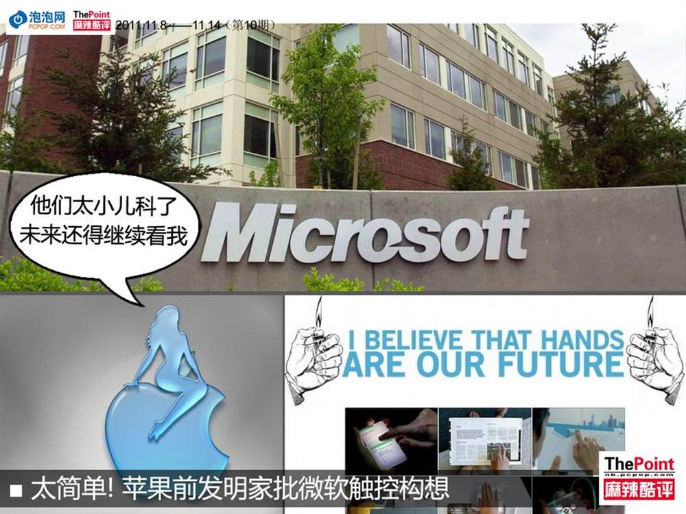此前,微软曾公开展示了后PC时代的触控应用构想,但近日曾在苹果担任人机界面研发的布雷特·维克托对其评价并不高,表示微软描绘的交互界面,仅是“现状的微小进步”。(详情请看:http://www.pcpop.com/doc/0/731/731122.shtml)8/9