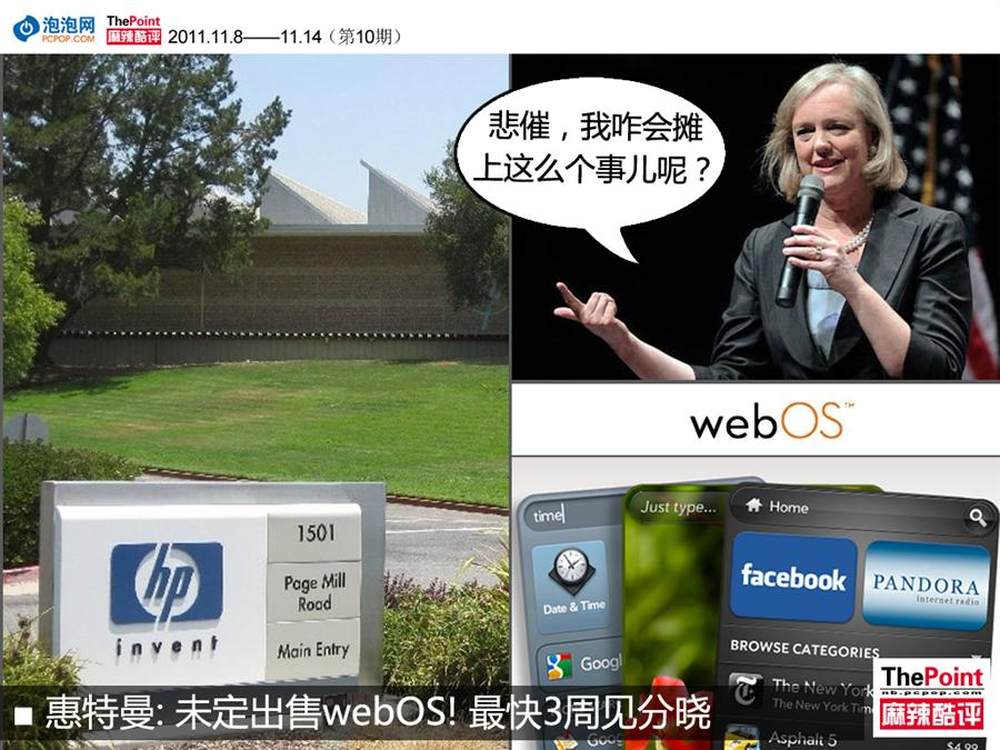 上周,惠普CEO梅格·惠特曼在公司全员大会上提到,目前公司尚无webOS部门处理的计划,并表示“对于我而言,真正重要的是作出正确的决策,而不是快速决策”。同时惠特曼再次承诺时间,表示未来3~4周内将决定webOS的命运。(详细请看:http://www.pcpop.com/doc/0/730/730463.shtml)