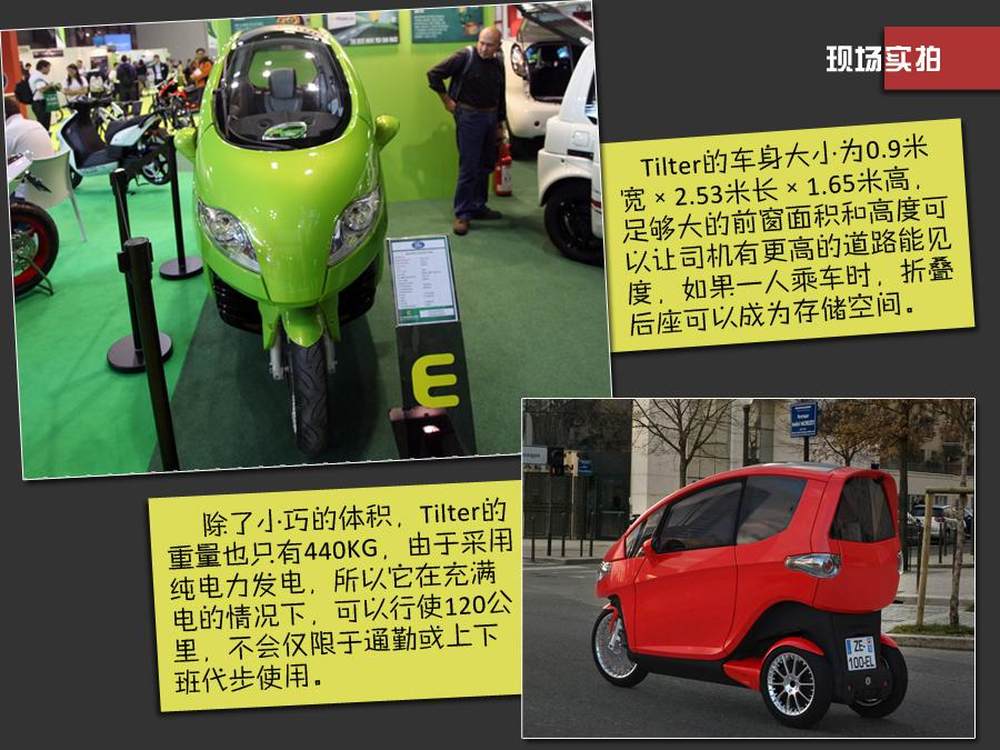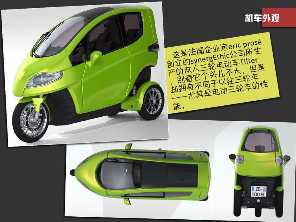 这是法国企业家eric prosé 创立的synergEthic公司所生产的双人三轮电动车Tilter,别看它个头儿不大,但是却拥有不同于以往三轮车——尤其是电动三轮车的性能。3/5