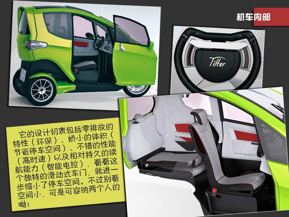 Tilter的车身大小为0.9米宽×2.53米长×1.65米高,足够大的前窗面积和高度可以让司机有更高的道路能见度,如果一人乘车时,折叠后座可以成为存储空间。除了小巧的体积,Tilter的重量也只有440KG,由于采用纯电力发电,所以它在充满电的情况下,可以行使120公里,不会仅限于通勤或上下班代步使用。5/5