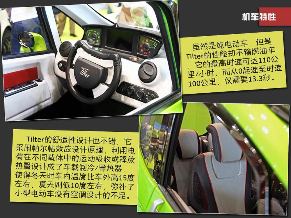 Tilter的舒适性设计也不错,它采用帕尔帖效应设计原理,利用电荷在不同载体中的运动吸收或释放热量设计成了车载制冷/导热器,使得冬天时车内温度至少比车外高10度以上,夏天则低15度左右,弥补了小型电动车没有空调设计的不足。