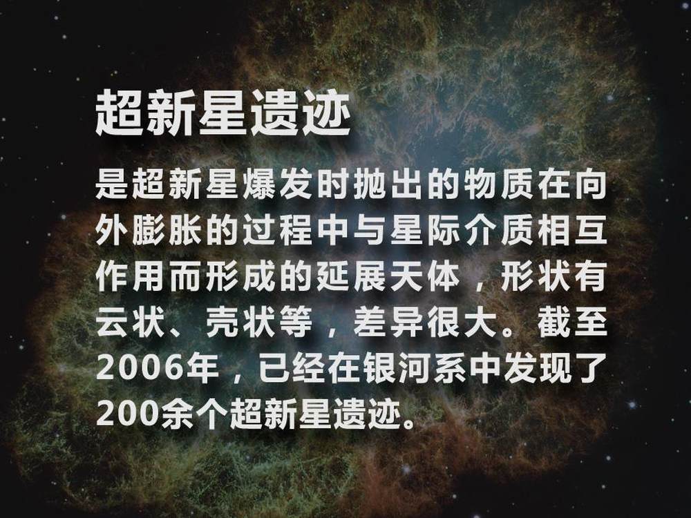 超新星遗迹:是超新星爆发时抛出的物质在向外膨胀的过程中与星际介质相互作用而形成的延展天体,形状有云状、壳状等,差异很大。截至2006年,已经在银河系中发现了200余个超新星遗迹。16/20