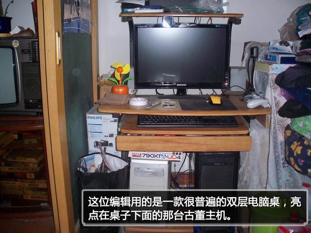 这位编辑用的是一款很普通的双层电脑桌,亮点在于左下角的古董机,还有就是桌子有些凌乱啊。8/18