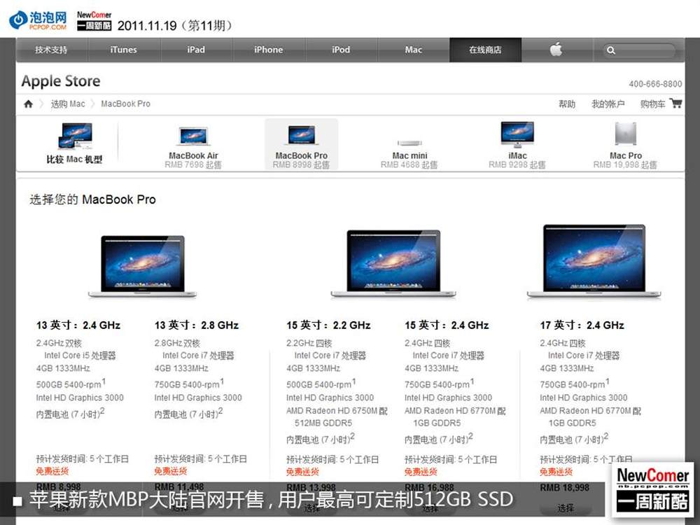 从苹果官网了解到,在中国区App Store支持人民币支付的同时,2011年10月底推出的新款MacBook Pro目前已在中国大陆官网开售,起售8998元,同时连同打印机购买可享受500元优惠。产品配置来看,本次更新产品包括13英寸、15英寸以及17英寸机型,处理器均出现小幅升级。内存及硬盘方面,苹果MBP新品均保持4GB及500GB~750GB标准。同时,苹果公司同样接受用户的硬件定制,最高可搭载2.5GHz四核处理器,配置8GB内存、750GB硬盘或128GB~512GB SSD。显卡方面,15吋机型从原有AMD HD6490M/6750M升级至AMD HD6750M/6770M,显存为512MB/1GB GDDR5,而17吋机型则有原先的AMD HD6750M设计值AMD HD6770M,显存同样为1GB GDDR5。此外,蓝牙4.0也成为新品标配。(详情请看:http://www.pcpop.com/doc/0/734/734141.shtml)3/8