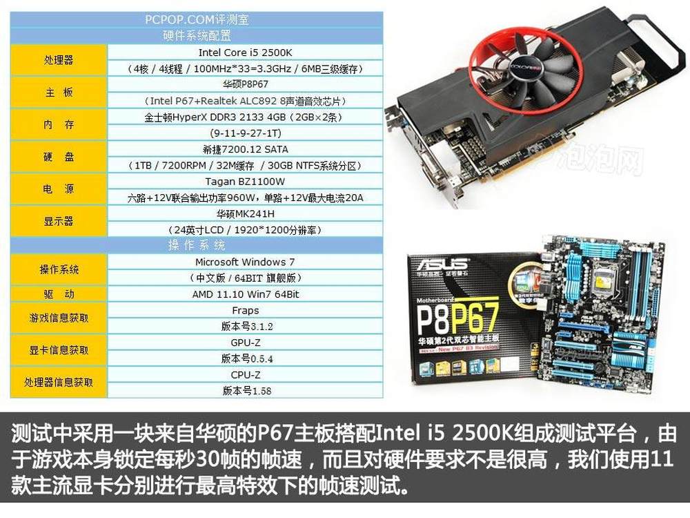 测试中采用一块来自华硕的P67主板搭配Intel i5 2500K组成测试平台,由于《极品飞车16:亡命狂飙》游戏本身锁定每秒30帧的帧速,而且对硬件要求不是很高,我们使用11款主流显卡分别进行最高特效下的帧速测试。20/23