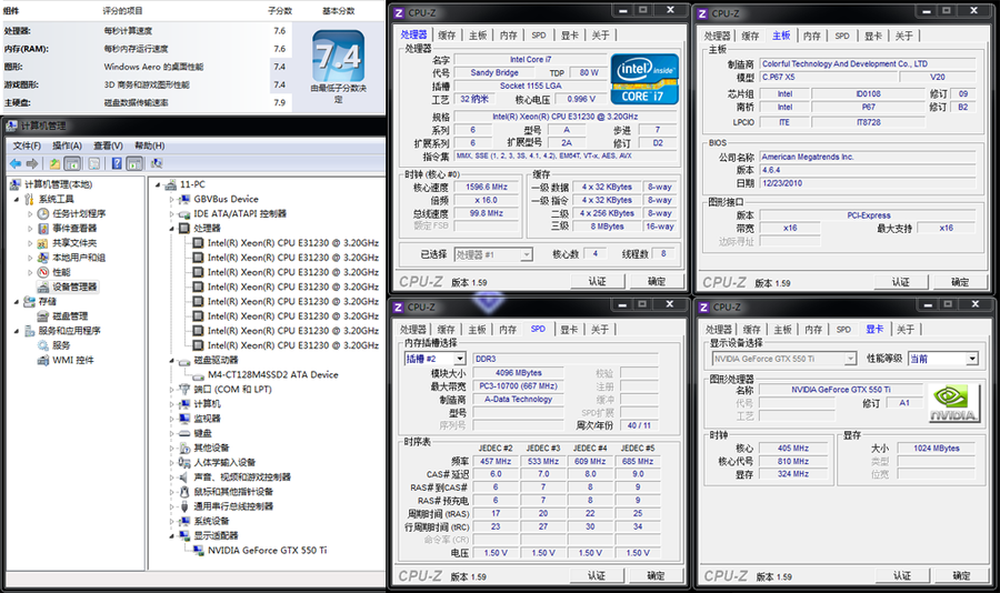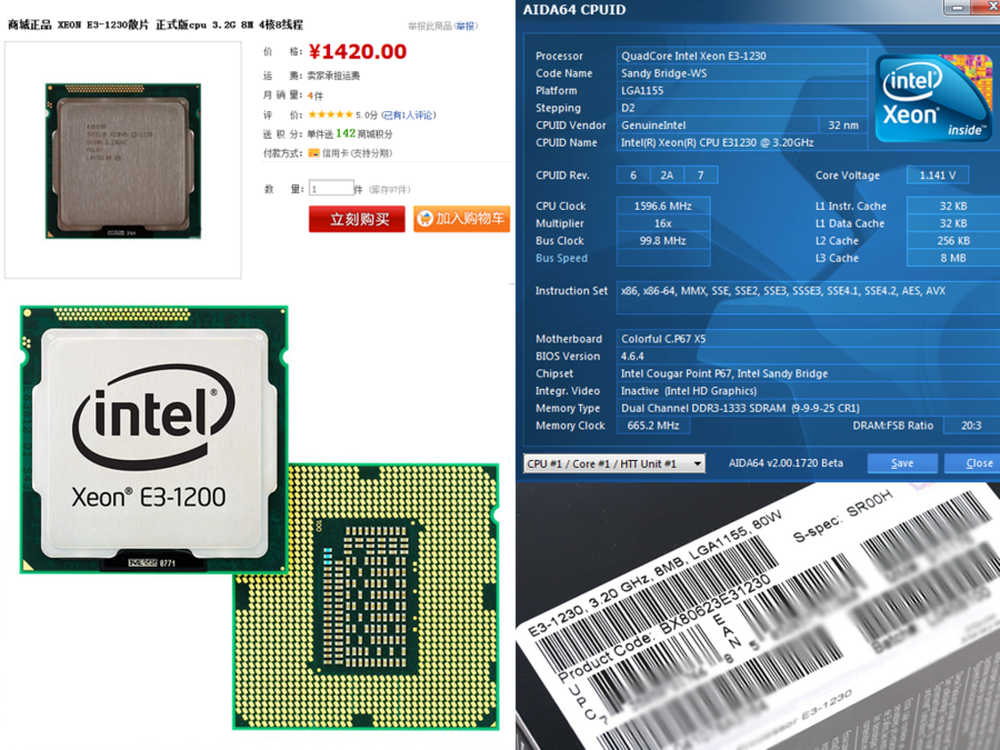 从淘宝购得的Intel Xeon E3-1230基于最先进的32nm Sandy Bridge架构,原生四核心设计,默认频率为3.2GHz,通过睿频技术可睿频到3.6GHz。它采用三级缓存设计,每个核心拥有独立的一、二级缓存,分别为64KB和256KB,四个核心共享8MB三级缓存。支持超线程技术、睿频加速技术2.0等先进技术,还具备服务器CPU独有的ECC内存技术,但是没有核芯显卡,可以看成Intel二代Core i7的降频版。4/21