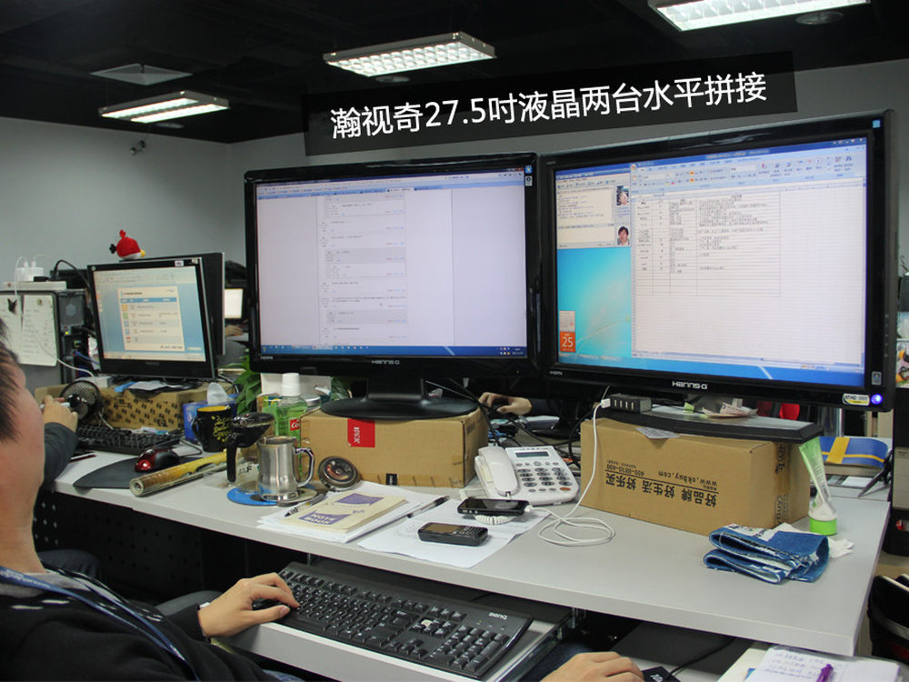 这位编辑这样说道:“早先瀚视奇有28吋液晶特价1999元时我就买了一台,1920×1200的分辨率看起来非常爽,而且这么大的尺寸点距足够大,即使我离得远眼睛也不费力。我看到很多编辑都用双屏办公提升效率,就用两台28吋水平拼接,因为我的工作就是一边去各大网站、论坛收集样本、数据,同时对这些数据进行分析和研究,有的时候还要经常用到Excel,这样左屏放数据,右屏做分析,也不用频繁拖动窗口。只不过显示器不能升降,所以还垫了高度,左右经常晃动脑袋,还活动了颈椎,眼睛也不用一直盯着一个屏幕,一举两得还提升效率。”3/12