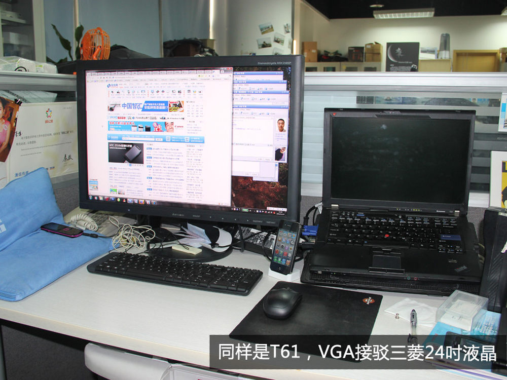 同样是用的ThinkPad T61,不同的是这位编辑只把它当做了主机,一直外接其它大屏显示器使用。正巧有三菱的MDC241GP可以体验,就替换了他平时用的24吋液晶。