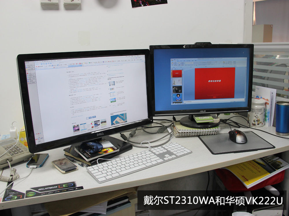 这是显示器频道主编的工位,相当整洁地说!左边是戴尔23吋VA广视角ST2310WA,右侧是22吋带摄像头功能的早期华硕液晶VK222U。一个1920×1080,一个1680×1050,所以水平拖曳时难免鼠标会有些许的滑动,他又是怎么看待高分辨率的呢?