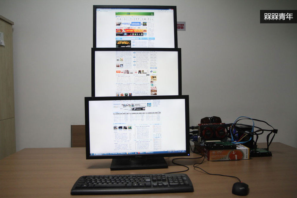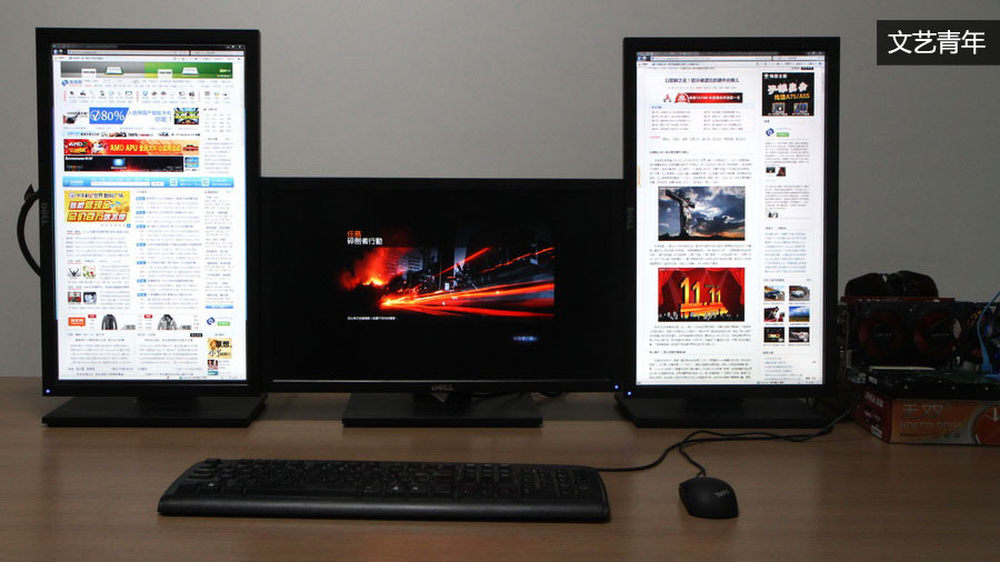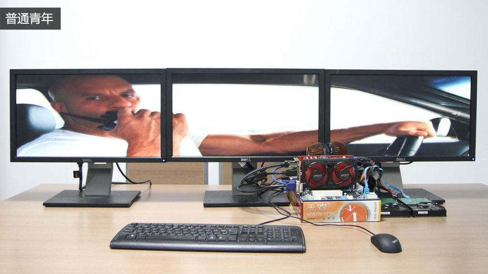 经过实际测试,一块只卖699元的双敏无双3 HD6770 DDR5白金版显卡便可以支持三屏幕系统的正常使用,不仅播高清、上网浏览等基本功能没有任何问题,甚至还能在三屏模式下流畅运行一些主流游戏,下面我们就来看看常见的三屏幕组合方式,并顺应潮流,了解一下普通青年、文艺青年、槑槑青年在使用三屏系统时的区别。3/14