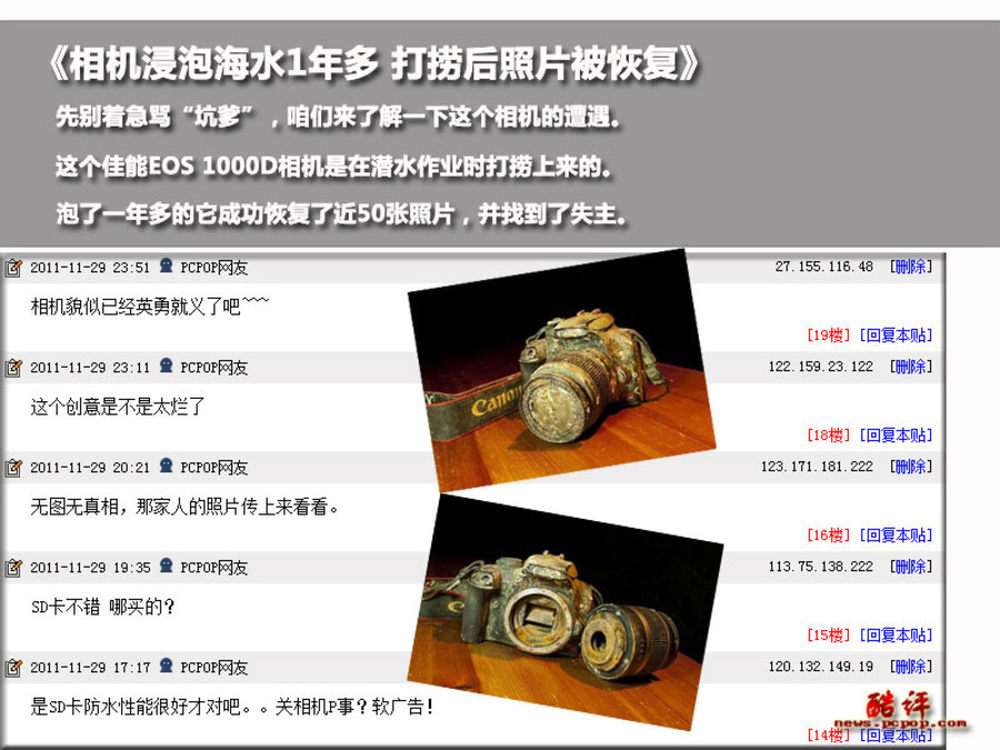 先别着急骂“坑爹”,咱们来了解一下这个相机的遭遇。这个佳能EOS 1000D相机是在潜水作业时打捞上来的。泡了一年多的它成功恢复了近50张照片,并找到了失主。