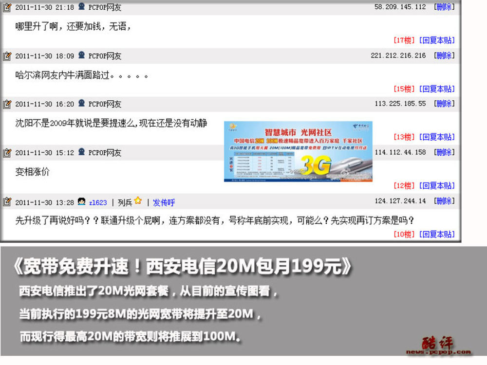 近日全国不少地方传出宽带免费提速的消息。据悉,西安电信推出了20M光网套餐,从目前的宣传图看,当前执行的199元8M的光网宽带将提升至20M,而现行得最高20M的带宽则将推展到100M。