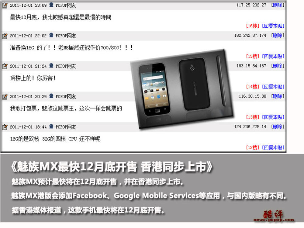 魅族MX预计最快将在12月底开售,并在香港同步上市。据悉,魅族MX香港版会添加Facebook、Google Mobile Services,和Android Market等应用,与国内版本略有不同。据香港媒体报道,这款手机最快将在12月底开售。